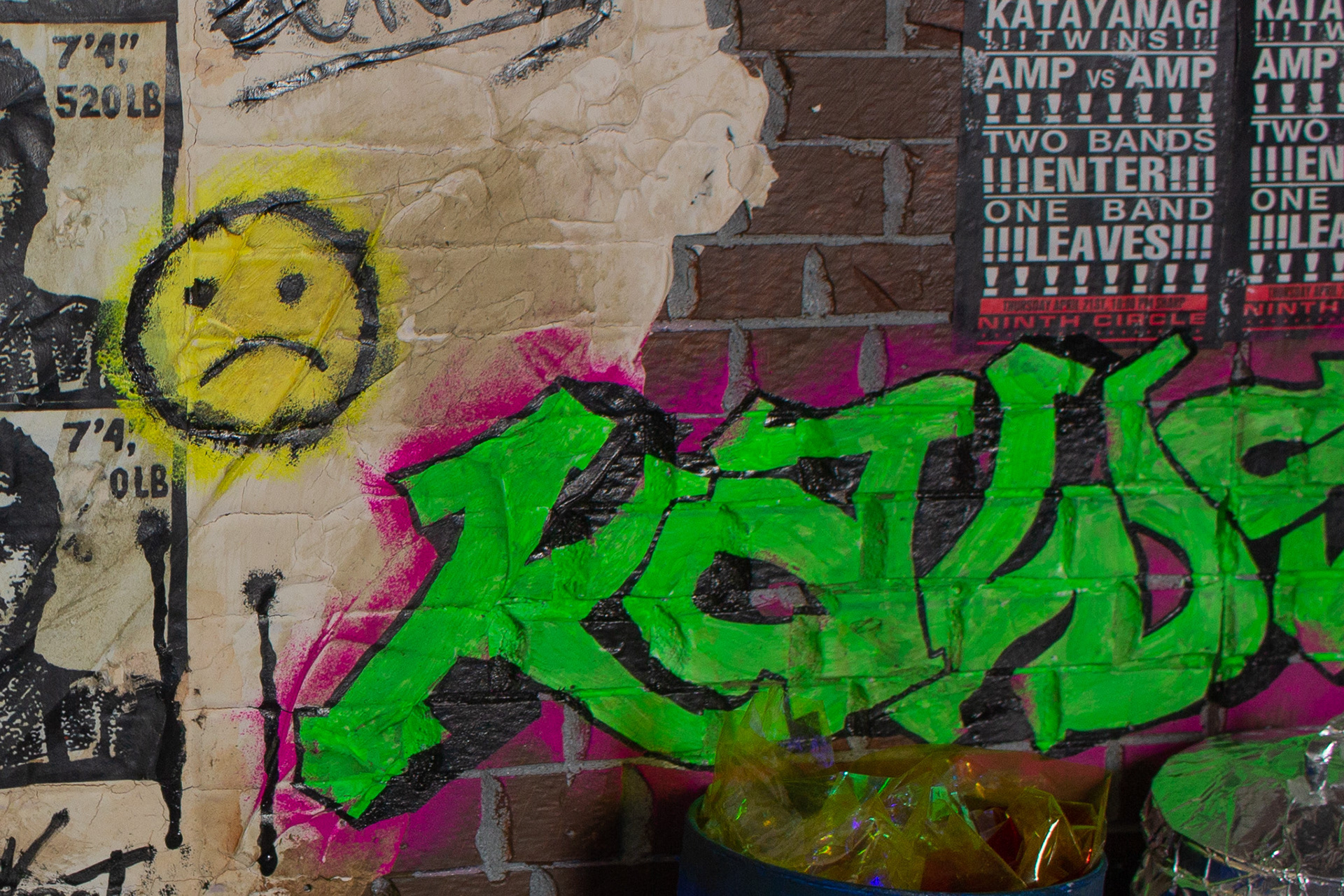This set was made from a combination of foam, cardboard, paper, modeling paste, wood, clay & found objects. Some things, like the silver trashcan, were actually originally an old pill bottle that I added ridges to and then covered in foil. Other objects were made entirely by hand like the banana box and the miniature food scraps, which were made using polymer clay. The brick walls were made using a hot tool on one solid piece of foam to carve the individual bricks and all of the graffiti you see on the walls was done entirely by hand without an airbrush. I'm a big fan of incorporating "easter eggs" in my work. (As I think most miniature artists and set decorators are.) If you look carefully, you will find nods to famous street artists on the walls including, Banksy, Brian Donnelly, & Shepard Fairey. My Scott Pilgrim fans might also notice a Toronto International Battle of the Bands poster or two.